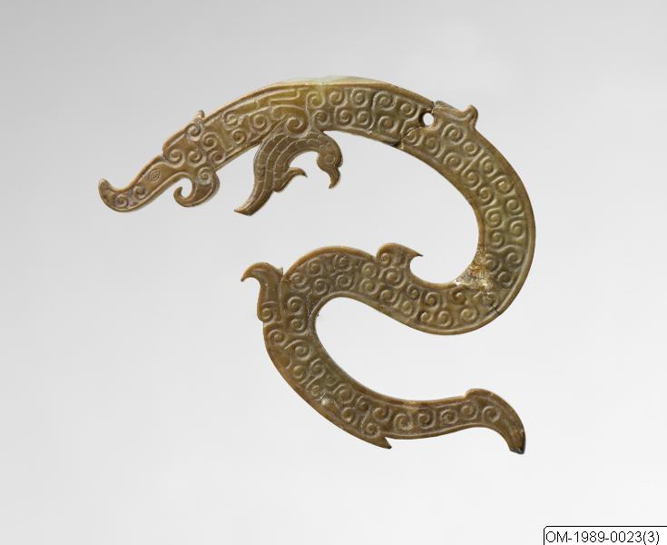 S-formad drake med spiraldekor. Jade Coiled dragon. Jade Sen Östra Zhou (400-talet–200-talet f.Kr.). Ernest Ericksons samling. OM-1989-0023