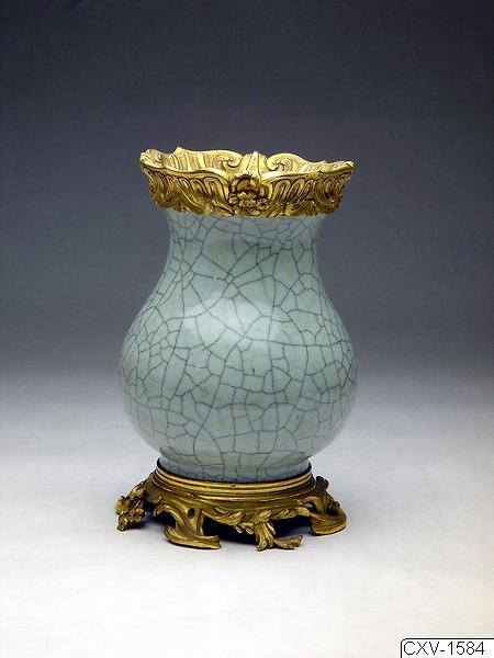 H:190 mm. Glasyren är krackelerad. Två vaser i samma stil: ID 102596-7 samt ID 102594-5 (rökelsekar?) Från svartbetsat vitrinskåp å södra väggen i porslinsmagasin.