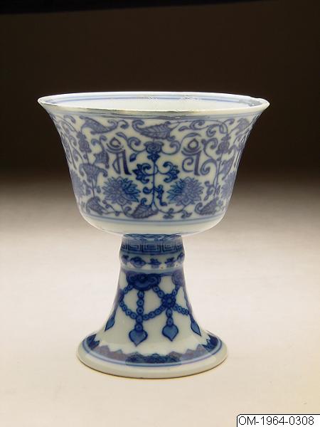 • Bägare på fot av porslin dekorerad i underglasyrblått. På undersidan finns tecken i gammal stil längs med fotens kant. Där finns också en ditsatt etikett med påskriften “Chen Lung”. Från monter 49.