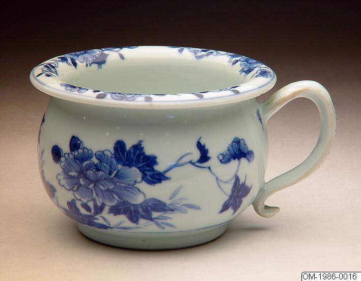 Spykopp formad som en barnpotta. Globulär form med låg fot, utvikt mynning och ett handtag. Porslin med dekor i underglasyrblått av piongrenar runt livet och grenar med blommor och frukter (sannolikt rosengrenar) runt mynningen. På handtaget mycket stiliserat blommotiv. Liten kantnagg på handtaget samt nagg på fotringen. (Från skeppet Geldermalsen, utgrävd av Hatcher's expedition. (Christie's Amsterdamaukt. -86, lot 1163)).
