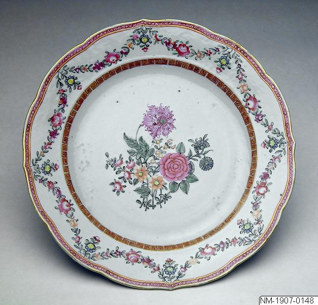 Tallrik av porslin dekorerad i polykroma emaljfärger och guld med blommotiv. Från monter 55.Höjd 2,5 cm, diam. 23 cm.