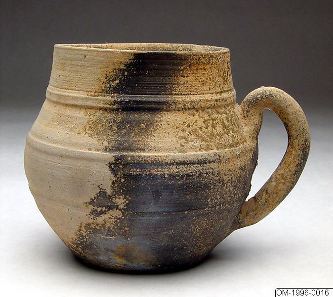 Den här runda koppen är smalare vid mynningen än runt buken. Mynningskanten går lätt inåt och sidorna sväller ut vid buken och smalnar sedan successivt av ner mot den platta basen. På ena sidan finns ett ganska stort öronformat handtag som kittats fast på kroppen. Två upphöjda band går runt koppen där mynningen möter skulrorna och på buken. Det finns ännu ett, knappt synbart band på bukens undre d...