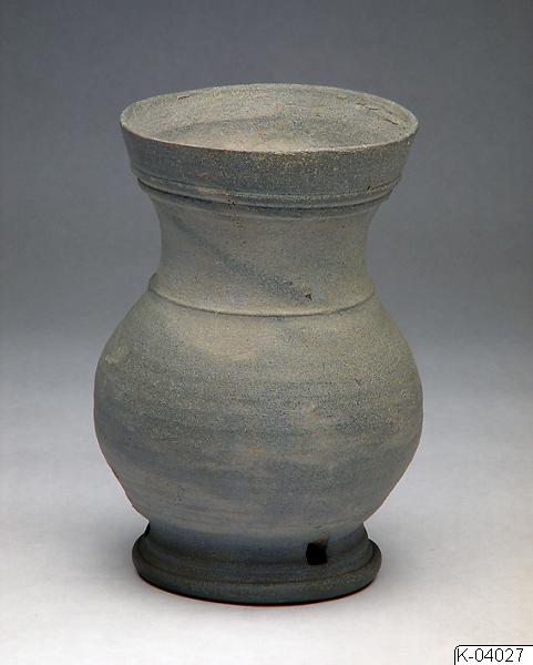 Raised on a relatively low pedestal foot, this jar has a wide flaring mouth and a long, curved neck that flows into a globular body. The pedestal has a wide circumference, which gives the jar a firm stance, and is simply decorated with three equidistant cut-out rectangles. Another decorative element consists of raised bands - two encircle the vessel below the rim, one at the shoulder and one at the pedestal. A potter's wheel was used to shape and smoothen the vessel. The clay has a fine composition. The surface has a bluish-grey colour and little accidental ash glaze. This pedestal jar is one of the objects that were acquired by His Majesty King Gustaf VI Adolf (1882 – 1973), then Crown Prince, and Her Majesty Crown Princess Louise (1889 – 1965) during their stay in Gyeongju, Korea, in 1926. The old catalogue records of the object state that it was found near Gyeongju, Gyeongsang region, which was the capital of the Silla kingdom. The jar was donated for inclusion in the East Asian Collections after the royal couple returned to Sweden in 1927. The visit of the former King of Sweden is an important event in Korean-Swedish relations, as he participated in the excavation of a royal tomb from the 5th or 6th centuries in Gyeongju, the Auspicious Pheonix tomb (Korean: Seobongchong), on 10th October 1926. The character "seo" in the tomb's name, which means "auspicious", was borrowed from the first character of the Korean name for Sweden (Seojeon). A golden royal crown with phoenix ornaments (Treasure No. 339) now held in the National Museum of Korea, was unearthed from the tomb, hence the character "bong" for Phoenix was included in the name. The Crown Prince acquired or was given a number of objects during his visit to Korea, most notably a precious gold earring which he received as a commemorative gift for the joint excavation on the Seobonchong tomb which is now held in the Korean collection of the Museum (K-04026-001). Today, an engraved stone stele in memory of the royal visit as well as a pine tree planted by the Crown Prince can still be seen at the site.