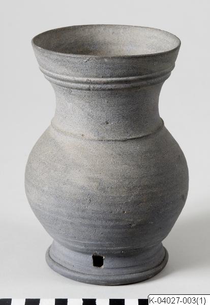 Se K-04027-003 Rätt accessionsnummer!!!, Vas av keramik på fot med tre genombrutna hål. Från monter 38. Höjd 17 cm, diam. 12 cm., Kruka av keramik på fot med tre genombrutna hål. Höjd 17 cm, diam. 12 cm. Funnit nära Keishû (Kuen-ju)(Gyongju), Södra Korea., Kruka, keramik. Korea. Från en samling av fyra föremål från Korea överlämnade till ÖS av Kronprinsen och Kronprinsessan [efter deras resa i Korea], Från samling av fyra föremål från Korea överlämnade till ÖS av kronprinsen och Kronprinsessan [efter deras resa i Korea]