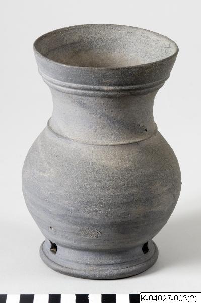 Se K-04027-003 Rätt accessionsnummer!!!, Vas av keramik på fot med tre genombrutna hål. Från monter 38. Höjd 17 cm, diam. 12 cm., Kruka av keramik på fot med tre genombrutna hål. Höjd 17 cm, diam. 12 ...
