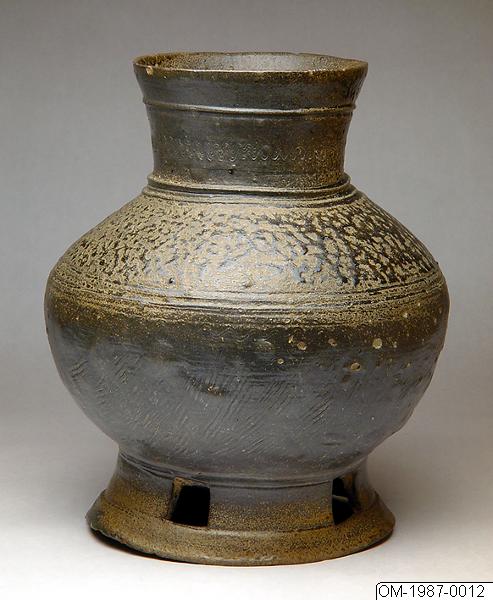 Kruka, stengods, med hög hals och genombruten fot. Stengods med askglasyr. Dekorerad med kammat vågmönster och inpressat mattmönster. Blåsor i godset efter bränningen. Korea. Äldre Silla. A. Kalbaks ...