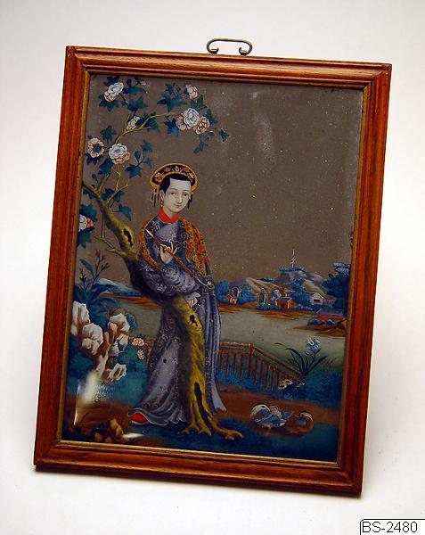 • Målning på glas gestaltande ung manchukvinna. För den europeiska marknaden.