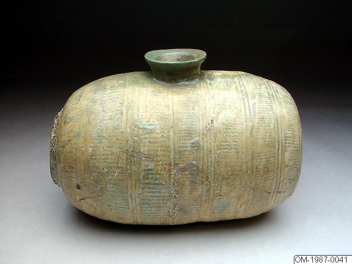 Of the shape of a traditional drum (hence the Korean name janggun), this bottle's mouth, with an everted lip on a short neck, is placed at the center of the long, cylindrical body. The foot is located on one of the round ends, however, the vessel was not intended to stand on it during usage; the foot served its purpose only during the production process. As this bottle was intended to be stored in a vertical position, the area opposite of the mouth had been flattened to create a base. The surface is decorated with stamped linear ("rope-curtain") patterns, arranged in seven registers encircling the body, inlaid with white slip. The end opposite to the foot rim adorned with a circular composition consisting of a single chrysanthemum surrounded by a band of five flowers of the same kind at the center, followed by concentric rings and another band of chrysanthemum flowers. The glaze has a greenish tinge. In several locations the walls have blistered up. Remains on the footrim show that the vessel was fired on grit.