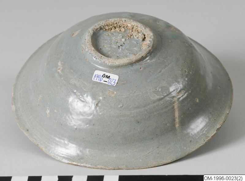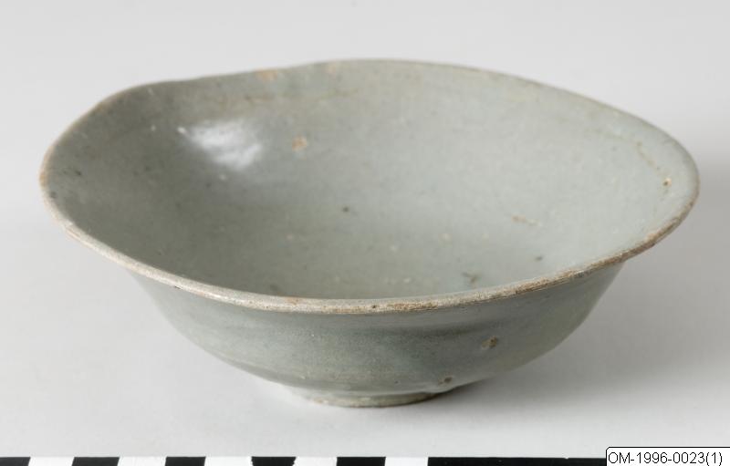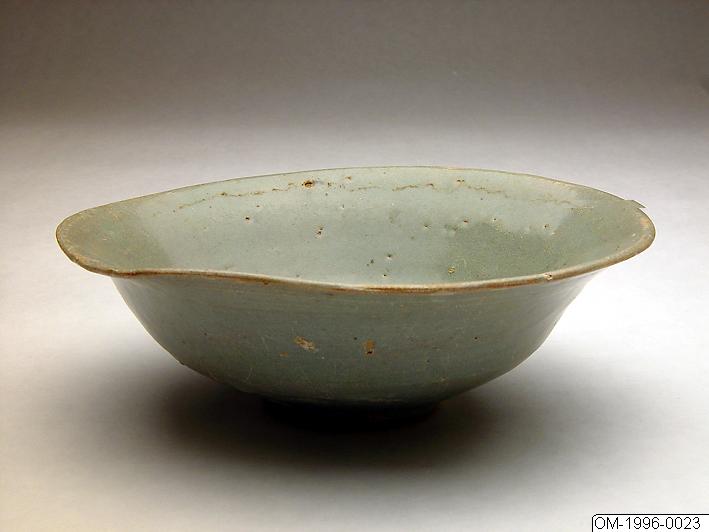 Skål av stengods med gråaktig celadonglasyr. Ojämn form. Höjd 5 cm, diam. 16 cm., Skål, stengods, celadonglasyr. Korea. Koryo. Gåva av Jens Warfvinge. Kantnaggar.