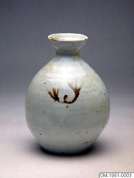 • Vinflaska av stengods. Markerad mynning. Gråvit, ojämn glasyr över halmfärgad slip. Dekorerad i underglasyr-järnbrunt med mycket stiliserade bambublad. Mynningen lagad med guldlack. Punch'ong-vara., F... Visa hela