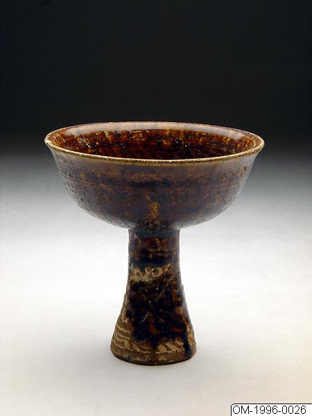 Skål på hög fot ("stem-cup"). Porslin med brun glasyr. Foten med inlaggd dekor under glasyren. Höjd 8,5 cm, diam. 8,5 cm., Skål på fot, glaserat porslin. Korea. Choson. Gåva av Jens Warfvinge. Foten skadad. Kantnagg, mynningen.