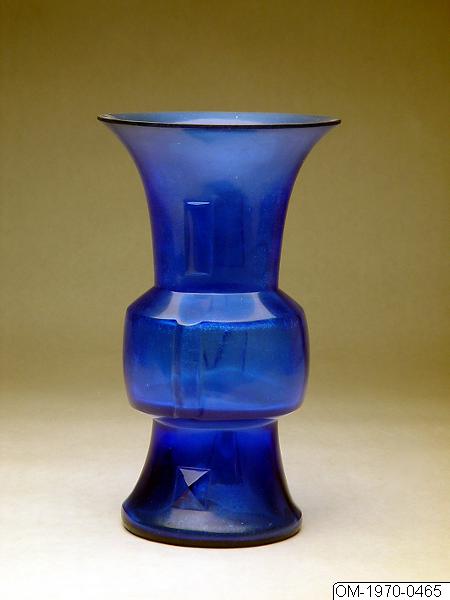 Zun-formad vas av blått glas. På undersidan Qianlong-märke Glass vase in the shape of a zun Qing-dynastin, Qianlong-perioden (1736-95). Gåva av Carl Kempe. OM-1970-0465