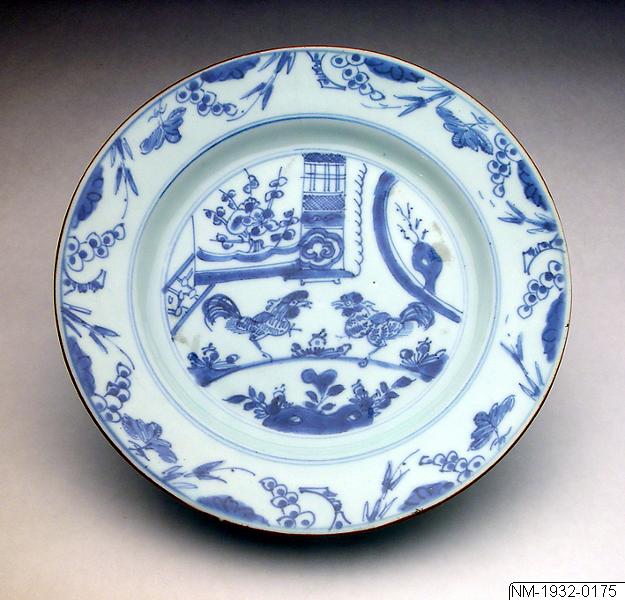 Fat, porslin, underglasyrblå dekor med motiv av två stridande tuppar. Qing-dynastin, ca 1740 Bärgad från skeppet Götheborg. Gåva. NM-1932-0175