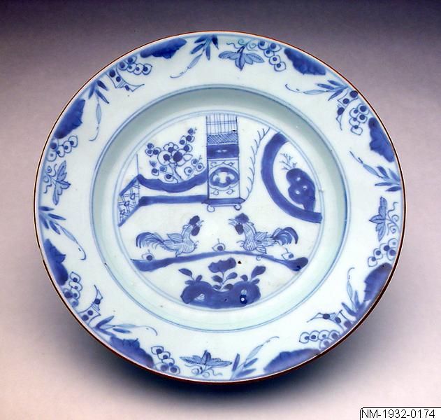 Tallrik av porslin. Dekorerad i underglasyrblått. På brättet blommor, i mitten två stridandes / fäktandes tuppar, blommor, m.m. Ostindiskt porslin, Kina, 1700-tal. Diameter 23 cm.