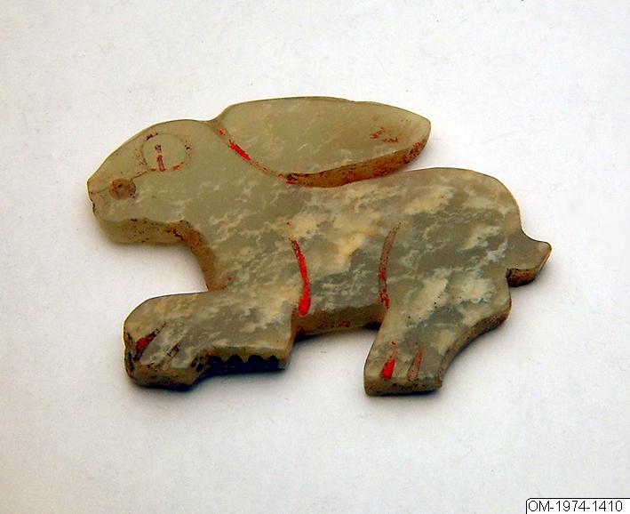 Enligt katalogkort: Skuttande hare Material: Gröngul jade med spår av cinnober. Närmare tidsbestämning: Zhou