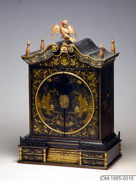 • Skåp av lackerat trä. Rektangulärt, med uppsvängt, genombrutet, profilerat krön med skurna blomornament. Stående på en underdel utformad som en terass med balustrad och en låda utformad som en trappa i mitten. Beslag av mässing och sidohandtag av förgylld brons. Krönet prytt med en fågel stående på ett musselskal i mitten samt fyra spetsiga pinjekottar. Det hela utfört i rödlackerat och förgyllt t... Visa hela