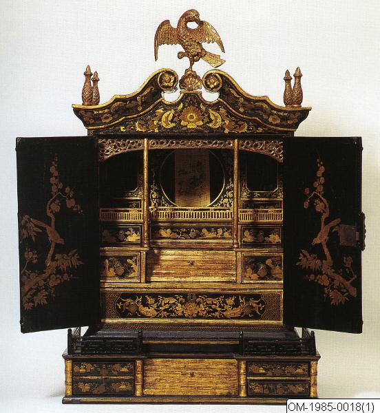 • Skåp av svartlackerat trä. Rikt skulpterat och dekorerat med lådinredning. Dekor i guldlack med sjö och landskapsmotiv samt fågel och blomsterdekor. I centrum en rund måndörr. I skåpet finns även en i... Visa hela