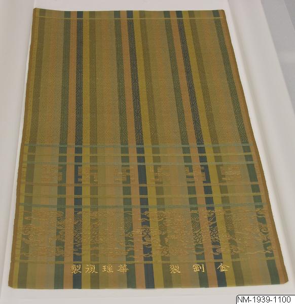 • Textilprov med motiv av ränder och svastikor. Längst ned tecken i guld. Inlagt i silkepapper och kartong. Rekonstruktion/återskapande av äldre textil-”tradition”, 1900-tal, Japan./PH