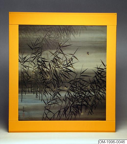 Ett stycke sammet bemålat med tusch med motiv av eldflugor i vass. Målningen är monterad på skiva med omgivande ram av orange textil. Från textilmagasinet. Mått (inkl. ram) 80 x 71,5 cm