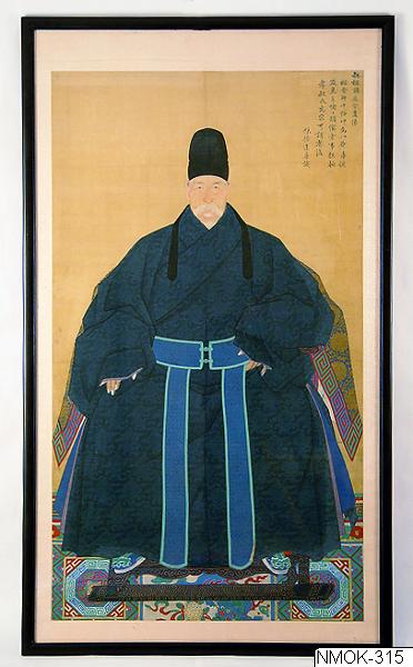 • "Ding Jin, en 'lärd och dygdig man'." Han sitter i en hög karmstol. Han har kort vitt skägg och mustascher och är iförd en mörkt grönblå mantel samt en hög svart mössa. Under stolen en matta i rika f... Visa hela