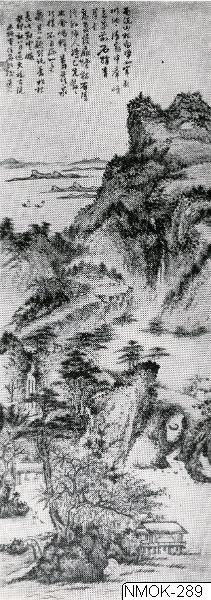 Konstnärens inskrift: Regnet har tvättat bergets fot, Den är ren som strömmens vatten en kall kväll, Massor av toppar, höljda i dimma,resa sig framför mig och på terassen står ett tempel bland grönskande träd, Ehuru det ligger högt uppe bland bergen, trän