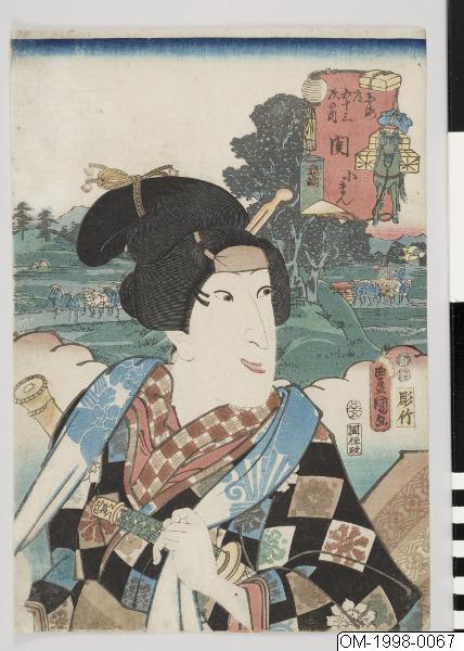Träsnitt (oban-format) i färger, föreställande en kvinna med ett svärd. Kabuki-motiv. Bakgrunden visar bl. a. en procession, berg och träd. Titelkartuschen i övre högra hörnet är röd och prydd av bl. a. en lastad häst, ett paraply och en lampa. Utagawa Kunisada (1786-1865; Toyokuni III)