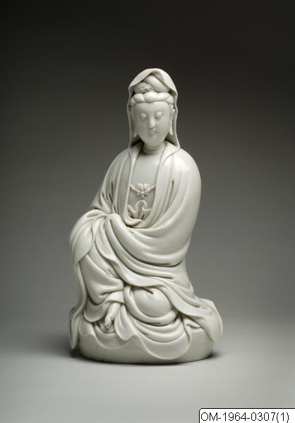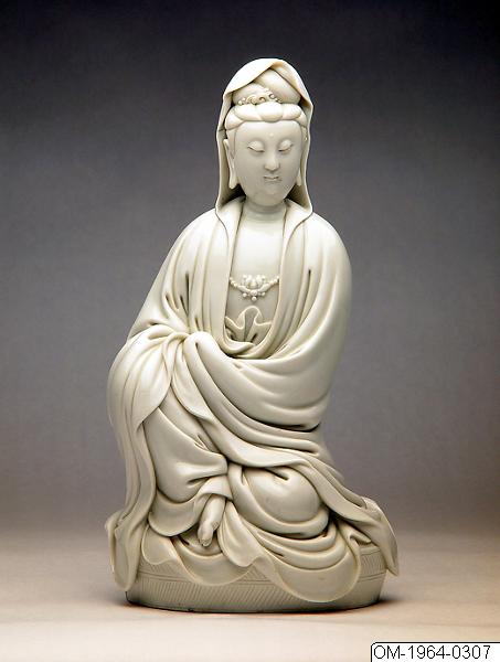 Figurin gestaltande Barmhärtighetens guddom, bodhisattvan Guanyin. Porslin med vit glasyr. Dehua-vara (blanc-de-chine). Signerad av He Chaozong. Qing-dynastin, 1600-talet. Fukien-provinsen. Gåva av Kinakommittén 1964, OM-1964-0307.