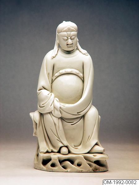 Figurin gestaltande guddomen Guangong. Porslin med färglös glasyr. Blanc-de-Chine (Dehua-vara). Sen Ming-dynasti, 1600-talets första hälft. Tillverkad i Dehua-distriktet, Fujian-provinsen. Inköpt i Stockholm 1957. Testamentarisk gåva av Greta och Georg Edlund. OM-1992-0082