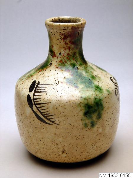 Vase/bottle of stoneware with cream-colored, copper green and dark glaze. Oribe-style, used in tea ceremonies. This vase is in Oribe style, a high-fired type of pottery which is most often green and/or black-glazed and has a pale glaze. Sometimes the shape is deliberately "distorted". Oribe ware was the brain-child of the feudal lord and tea master Furuta Oribe (1545-1615). Oribe succeded Rikyu as tea master to the leading Japanese personnages. Aesthetically, Oribe ware differs a great deal from the more anonymous, simple, "natural" beauty of raku ware and instead comes across as a personalised product of human creativity. (Based on the text for the exhibition catalogue Japan. Artefacts and images tell the story. 2011). /PH