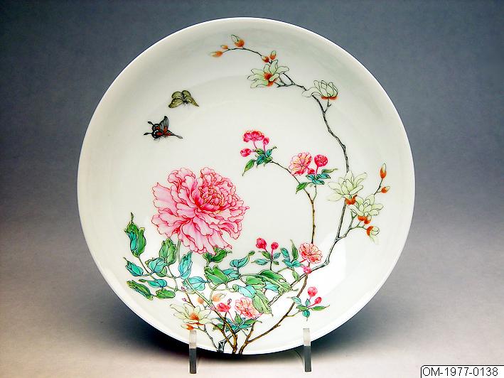 Fat, porslin, emaljdekor av pioner, magnolia och fjärilar Qing-dynastin, Yongzheng 1723-1735 Axel och Nora Lundgrens stiftelse. ÖM-1977-0138