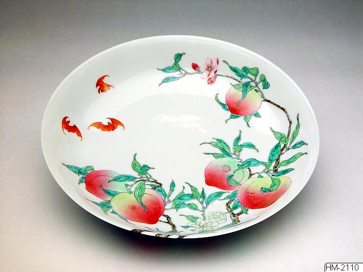 Fat, porslin, emaljdekor av persikor och fladdermöss Qing-dynastin, Yongzheng 1723-1735 Gustav VI Adolfs gåva. HM-2110