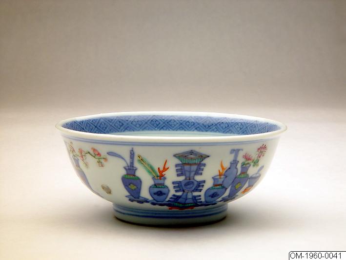 • Från monter 10, Qing-salen. Enligt montertext: “Kopp med vasdekorer i underglasyrblått och emaljfärger. Märke och tid: Xianfeng (1851-1861). Gåva av Dr. Carl Kempe genom Föreningen ÖMV.”