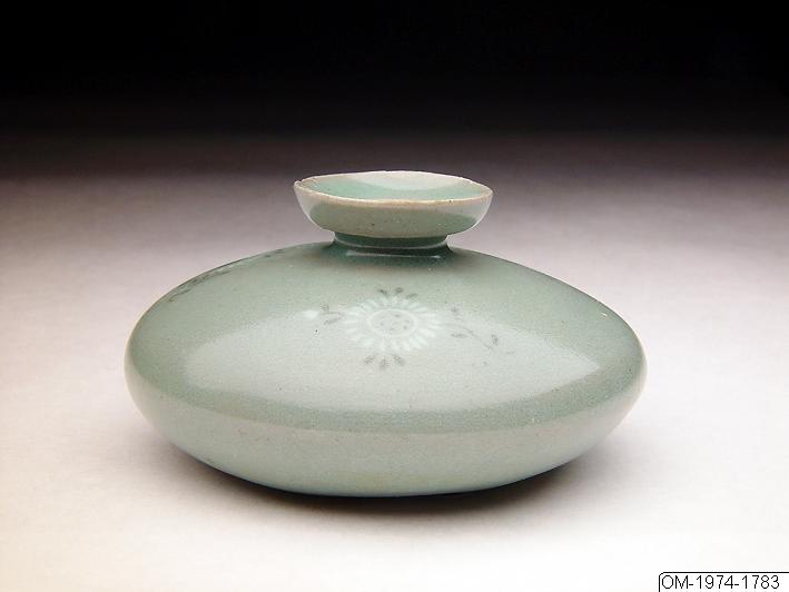 Enligt katalogkort: Liten koreansk vattenbehållare, plattad och med trång mynning. ”mishima”-dekor med tre prästkrage-lika blommor. Celadonglasyr.