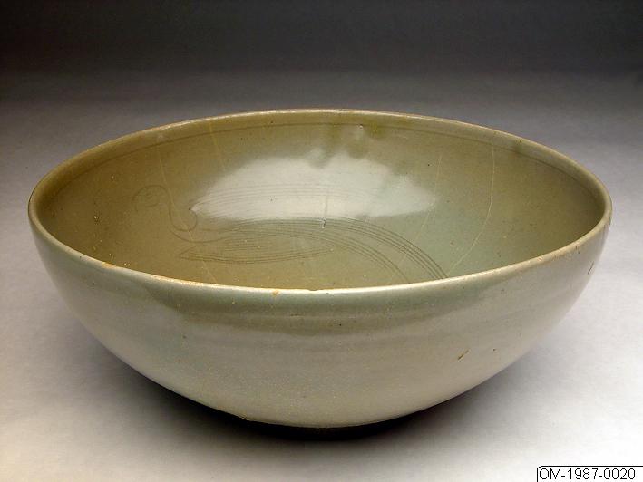 Skål, stengods. Korea, Koryoperioden., Skål med inristad dekor av två stiliserade fåglar på insidan. Stengods med grågrön, svagt krackelerad celadonglasyr. Märken efter bränningsstöd. A. Kalbaks saml...