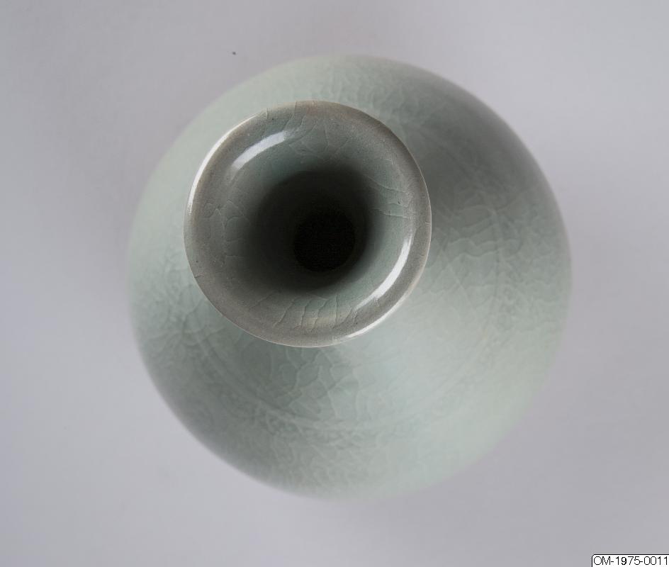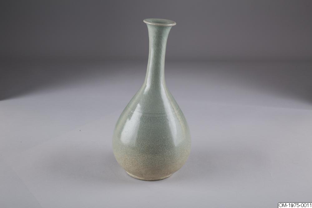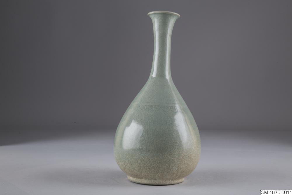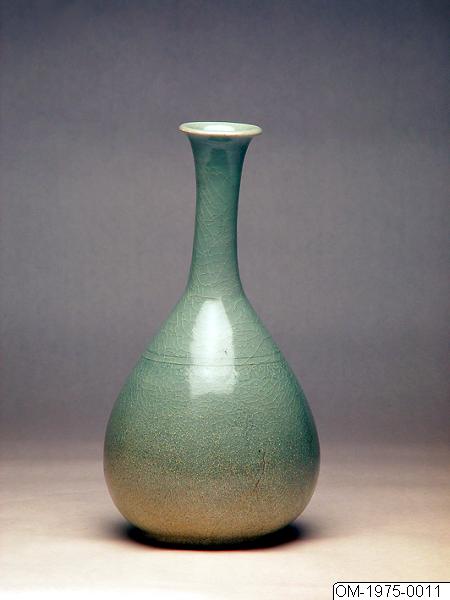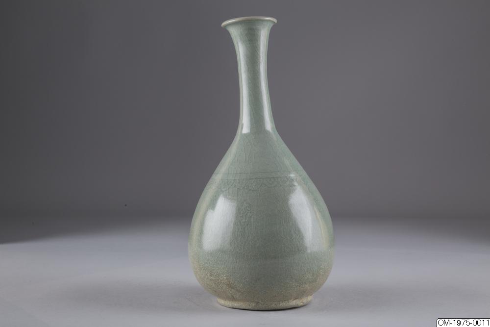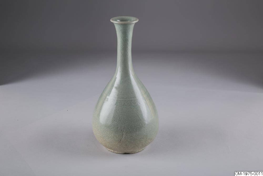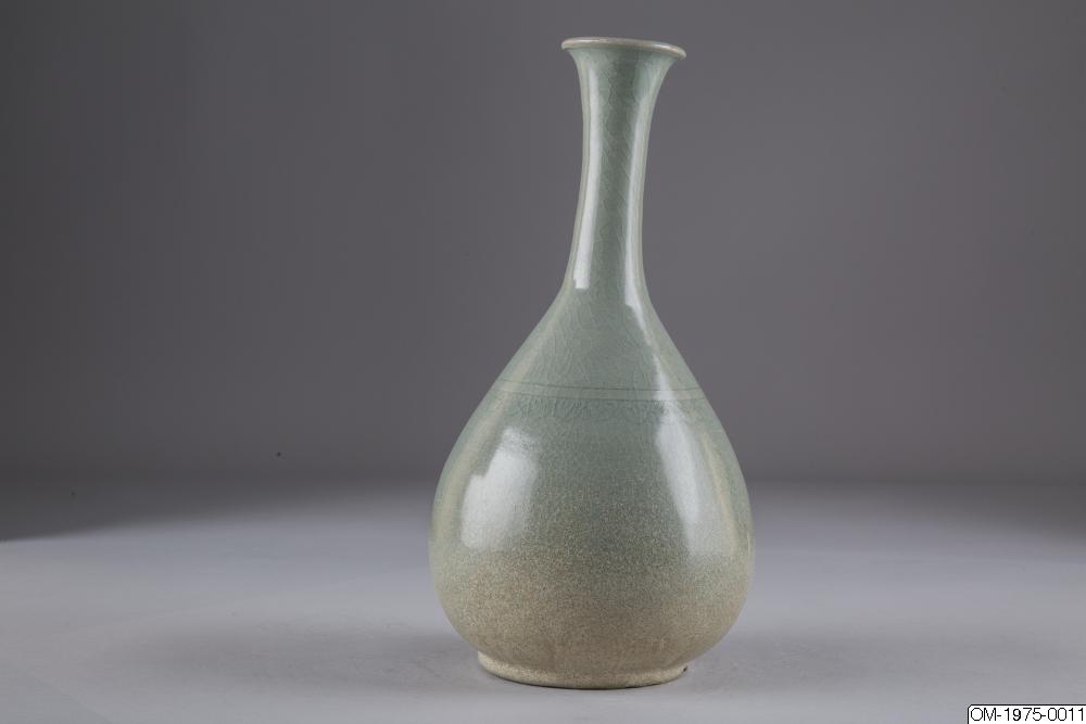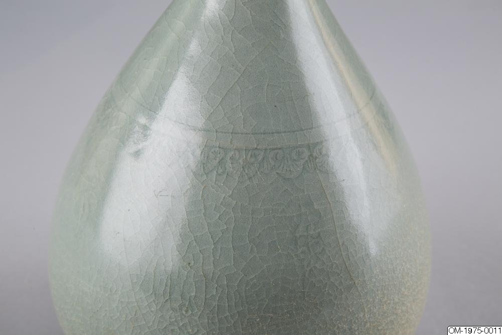 With a flaring lip, a long neck and a pear-shaped round body, this delicate bottle is of almost perfect symmetry. An incised double-line with a band of yeouidu (cloud-shaped wish-granting symbols) encircle the bottle at the sloping shoulders, and stylized cloud symbols adorn the bulging sides of the vessel. The bottom section is encircled with a band of lotus petals, arranged in two rows. The glaze has a bluish-green tinge and crackles, denser in the bottom area. The glaze at the bottom of the bottle, as well as the foot and base has a brownish color as a result of overfiring. Marks from five silica chips, placed equidistant, can be seen inside and on the edge of the footrim. The elegant shape, the subtlety of the design and the jade-like color of the glaze are typical features of 12th century Goryeo celadon wares.