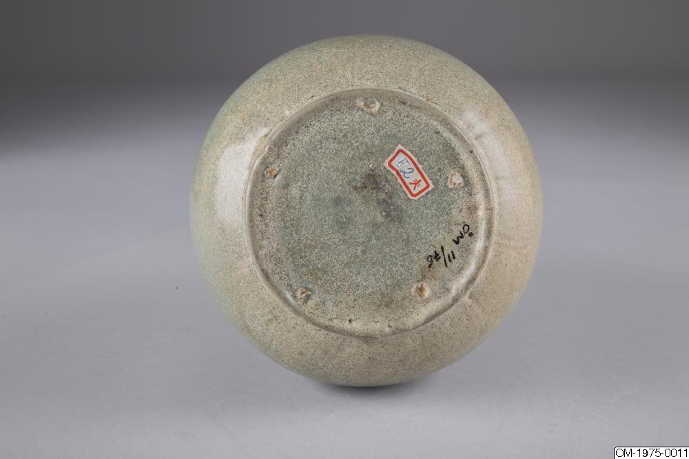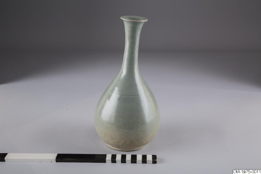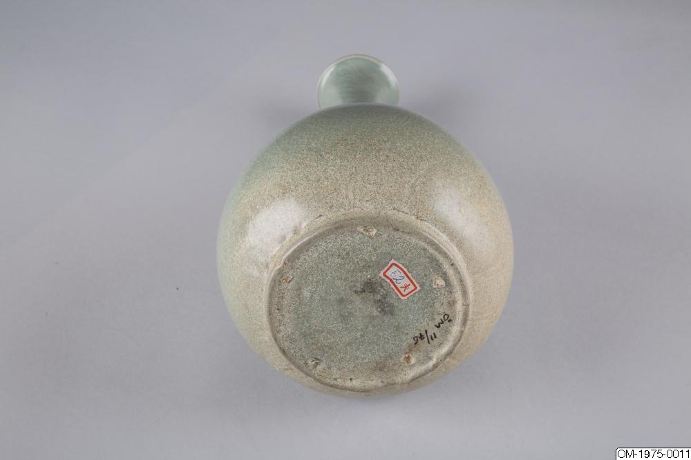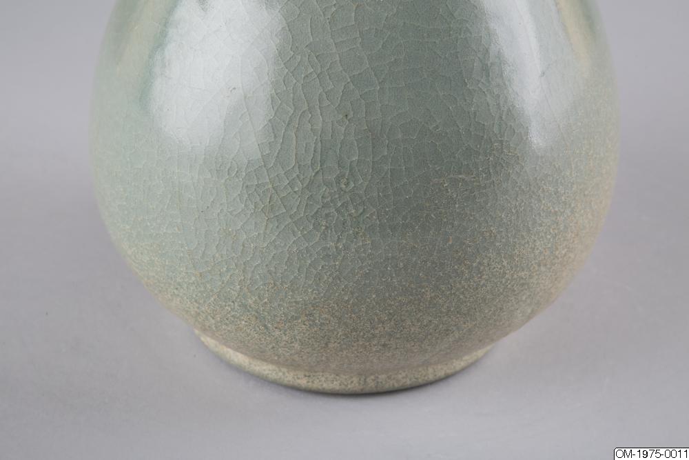 Vas i flaskform av stengods med pressad dekor av ruyi bård under celadonglasyr. Koryo., Vas, stengods. Korea, Koryoperioden. Gåva av Tage Grönwall Sprickor.