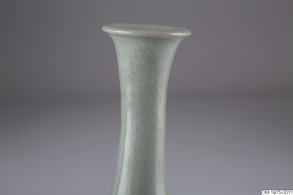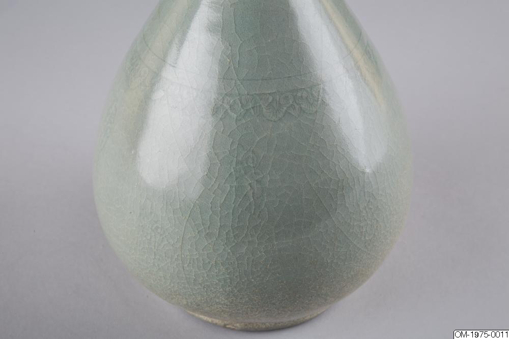 Flaskformad vas med pressad dekor av ruyi-bård och moln. Celadonglasyr. Höjd: 28 cm. Diam: ca.15,5 cm. Från Japansalen, väggmonter.