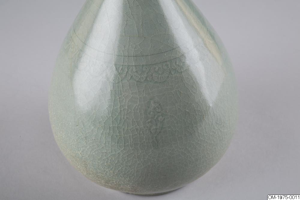 Den här utsökta flaskan har med sin utsvängda mynning, sin långa hals och sin päronformade runda kropp en nästan perfekt symmetri. En inristad dubbel linje med en yeouidu-bård (molnformade önskebringande symboler) går runt flaskans sluttande skuldror och stiliserade molnsymboler smyckar kroppens utbukande sidor. På flaskans lägre del går en bård med lotusblad i två rader runt kroppen. Glasyren är ...