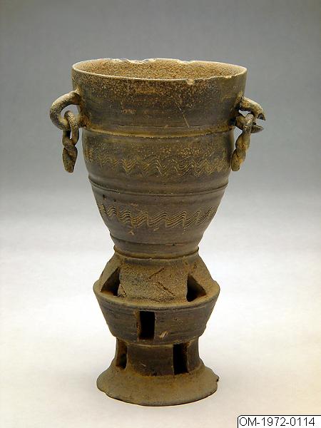 Bägare, hög trapetsoid med genombruten fot. Tre öglor med kläppar. Silla., Klockbägare, stengods. Korea, äldre Silla. (300-668 e.Kr) Gåva av Lars Erik Warfvinge Vid upppackandet upptäctes skada på ögla-bit fattas! se foto. /2004-05-06 Limning, gipsfyllning och retuschering 2010-11-22/IJ