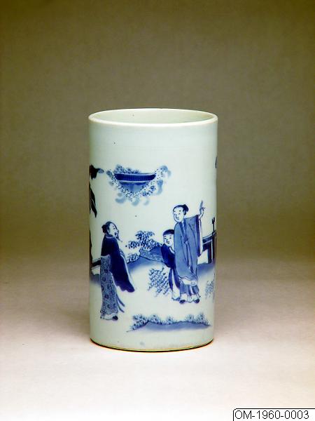 Penselstöd av porslin. Cylindrisk form med något konkav botten. Dekor i underglasyrblått med figurer i landskap, samt bananträd.