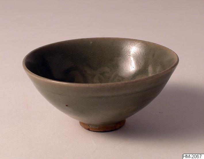 Acc.nr. ändrat från HM 2067 till GVIA-2067. Kopp i klockform med invändig pressad dekor av änder bland lotus. Olivfärgad glasyr. Gustav VI Adolfs gåva. Höjd: 3,9 cm Diam: 8,3 cm från tang-Ming, mo...