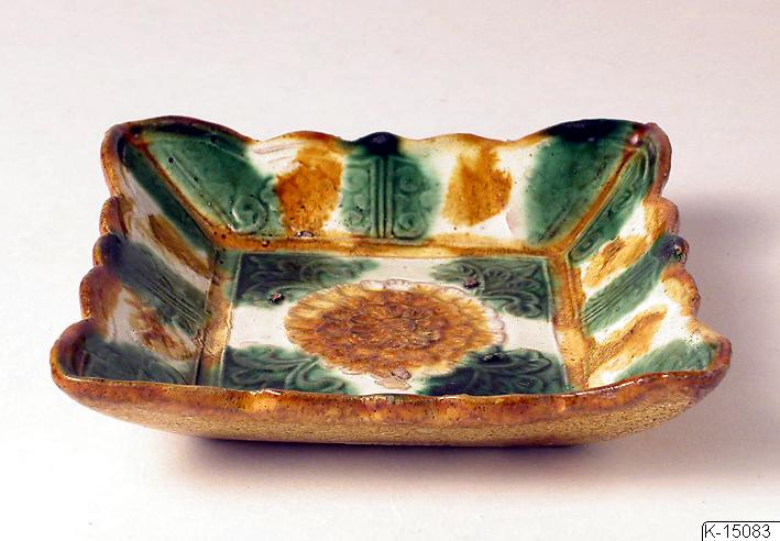 Fat, fyrkantigt med vågig kant, i mitten pressad dekor av blad och krysantemum. Lergods täckt med grön, brun, gul och vit glasyr.