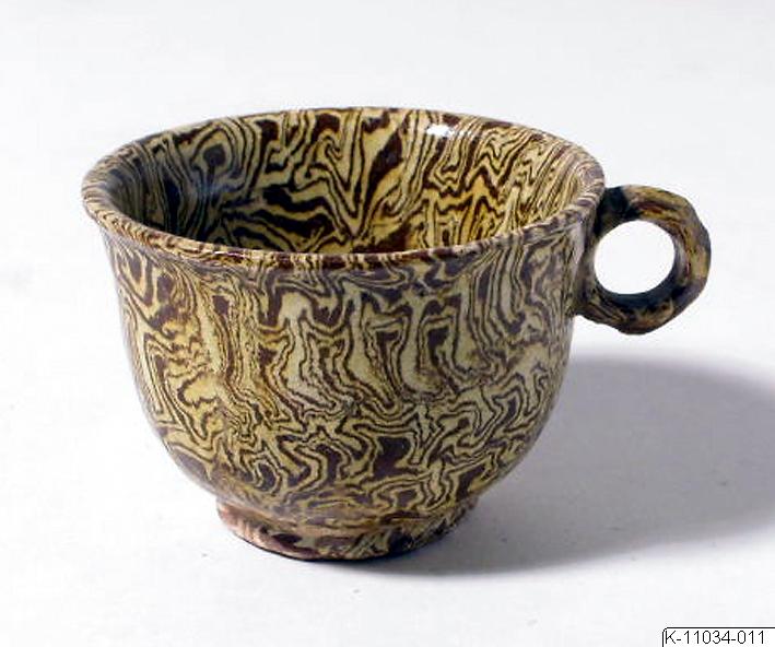 Kopp med öra, marmorerat lergods. Transparent gul blyglasyr. Formen hämtad från västasiatiska silverkoppar. Tang-dynastin, 618-906 e.Kr. Inköpt av O. Karlbeck i Shanghai 1929. K-11034-011.