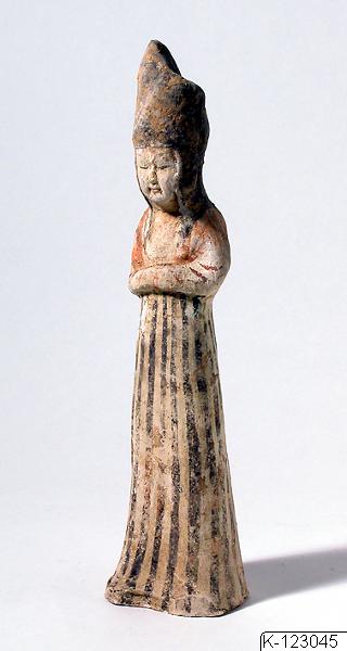 Gravfigurin av lergods, gravgods gestaltande en kvinna. Spår av bemålning. Tang-dynastin, 618-906 e.Kr. Inköpt av J.G. Andersson i Beijing före 1938, K-12304-b.