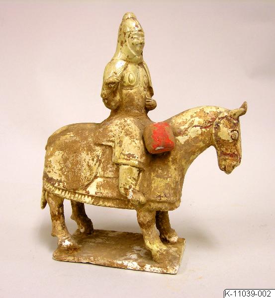 Figurin av lergods, gravgods. Man till häst. Spår av gul och röd glasyr. Tang-dynastin, 618-906 e.Kr. Inköpt av O. Karlbeck i Beijing 1929, K-11039-002.