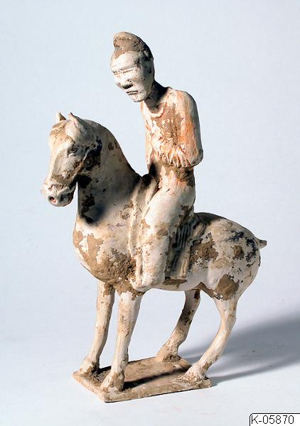 Eunuck till häst. Ljust lergods med spår av röd bemålning. Från Tang-Ming, monter 6. Höjd: 31,5 cm Längd: 23 cm Bredd: ca.8,5 cm.