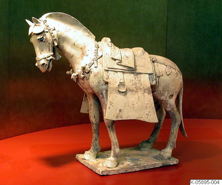 Föremålet står i montertexten angivet som K-05894-004. Häst av ljust lergods med halmfärgad glasyr och spår av bemålning. Höjd: 45 cm Längd: ca.48 cm Bredd: 21,5 cm