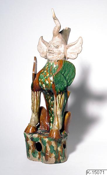 Väktardjur på hög bas, med bevingade framben, behornat huvud (vridet horn), öppen mun och stora vingformade öron. Ljust lergods med blyglasyr av trefärgstyp,s.k. sancai. Huvudet är oglaserat och bär spår av röd färg. Från Tang-Ming, monter 5. Höjd: 68,5 cm Bredd: ca.26 cm Djup: ca.20 cm.