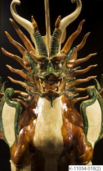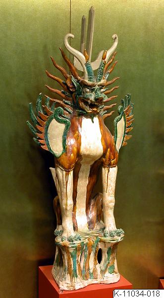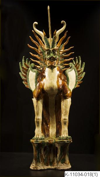 Väktardjur på hög bas, med bevingade framben, horn och öppen mun visande tänderna. Dekorerat bröstpansar. Blyglasyr av trefärgstyp, s.k. sancai. Från Tang-Ming, monter 5. Höjd: 99 cm Bredd: 46 cm Djup: 30 cm.