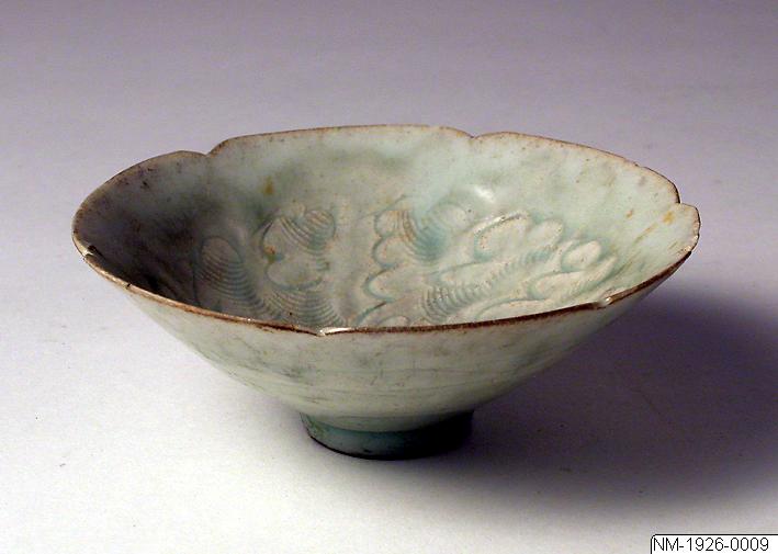 Skål av porslin. Konsik form med sex små urtagningar i kanten. Med pressad eller ristad ornering av molnband under grågrön glasyr. Skiftande i ljust blått. Höjd. 5 cm. Diameter 12 cm. Kina, Song-dynastin.